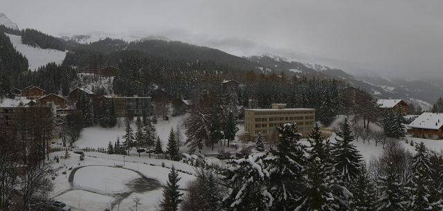 50 of Meribel’s 63 trails are skiable today, which isn’t bad going at all, and snow’s expected to fall from 1900m tomorrow. Skiers are sliding on a base of 145cm up top, and there’s 83cm down in resort. This was the Versant Saulire webcam earlier on which has seen 5cm of fresh snow so far today.