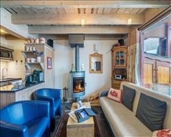 From the living room, direct access to the furnished terrace extends the living space outdoors. This inviting area is perfect for unwinding, with lounge chairs ideal for soaking up the sun and enjoying the fresh mountain air at any time of day.