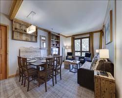 The dining area can seat up to 6 guests around a large raw-wood table with velvet chairs.