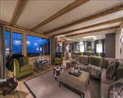 A wood burning fire place sits in front of the comfy sofa and stylish seating area, perfect for relaxing with a good book after a hard day's skiing. This apartment features a flat screen TV and Wi-Fi access for your convenience and entertainment.
