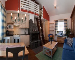 Superior Sauna Suites sleep two to four people and are located in a separate building. Spacious pine-clad one room suites with double bed, private sauna, and lounge area. Suites can accommodate 2 extra beds for children