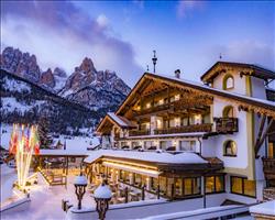 An elegant, family-run pick, this hotel is smack-bang in the middle of the Dolomite mountains. The lifts to the Val di Fassa ski area are a short bus ride away, and the bus stops just outside the hotel so it couldn't be easier to get out skiing each day. And the facilities are top-notch too. Swap the slopes for the spa to really relax after a day on the hill – the pool and hot tub are inside a unique glass pyramid building, so you can take a dip and enjoy views of the snowy mountains at the same time.