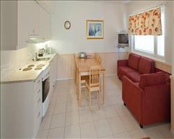 2 bedroom apartment with bunkbed, balcony and sauna (45m ²) – sleeps 2-6: Twin bedroom, alcove room with bunk beds, living area with double sofa bed, private shower, WC, sauna and balcony. These apartments also have an oven.